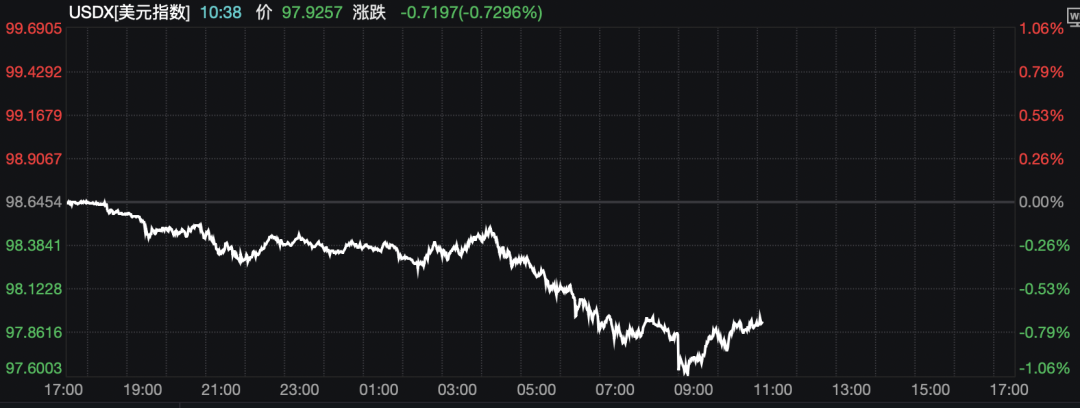 现货黄金盘中拉升,一度涨超1.3%,逼近3400美元/盎司。美元指数盘中跳水,跌至3年多来最低水平。