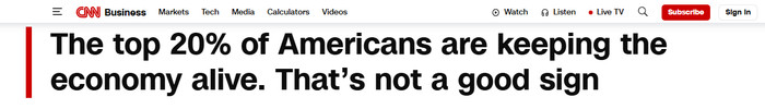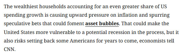 还有经济学家在文章中表示,最富裕家庭在美国消费增长中占据更大份额,正对通胀造成上行压力,并刺激可能催生资产泡沫的投机行为。这不仅可能使美国在经济进程中更容易陷入潜在衰退,还可能让部分美国民众在未来数年陷入困境。