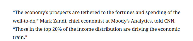 马克・赞迪认为,无论出于何种原因,如果高收入群体在消费上变得更加谨慎,经济将陷入衰退。他指出,若股价出现重大回调就可能引发这种局面,因为推动“富裕”群体消费的财富大多与强劲的金融市场表现挂钩。