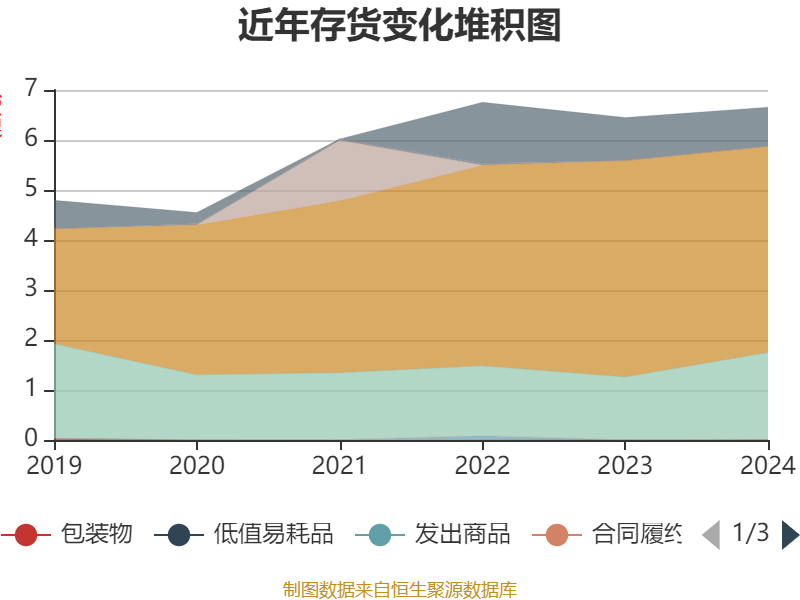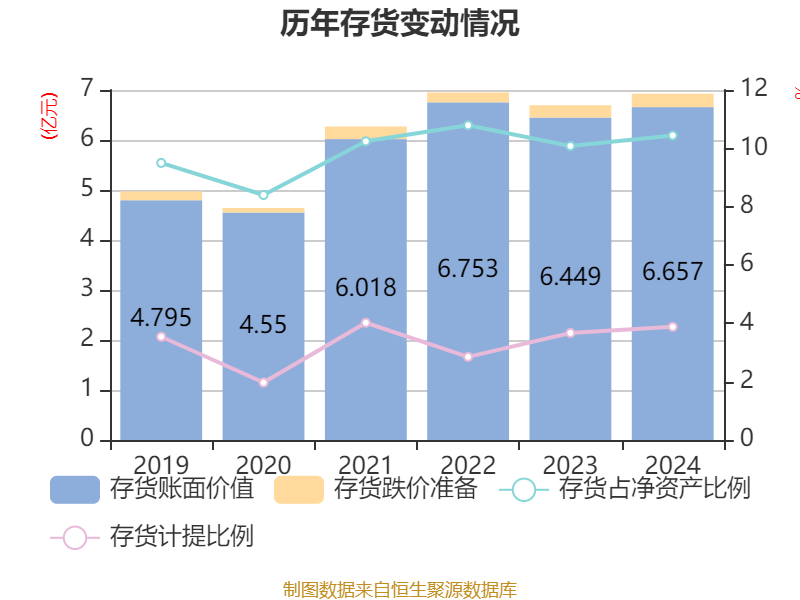 从存货变动来看,截至2024年末,公司存货账面价值为6.66亿元,占净资产的10.44%,较上年末增加2081万元。其中,存货跌价准备为2685.36万元,计提比例为3.88%。