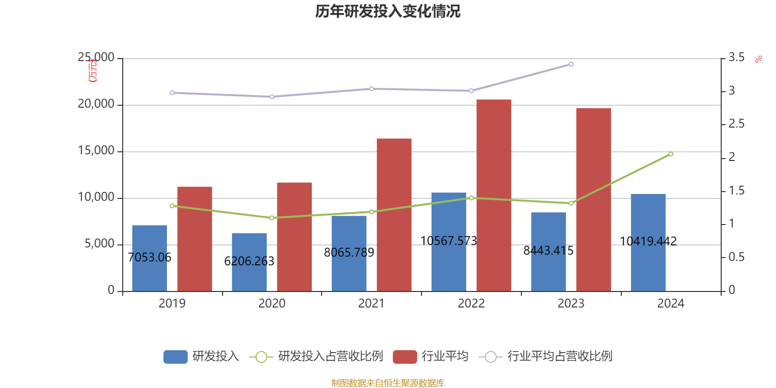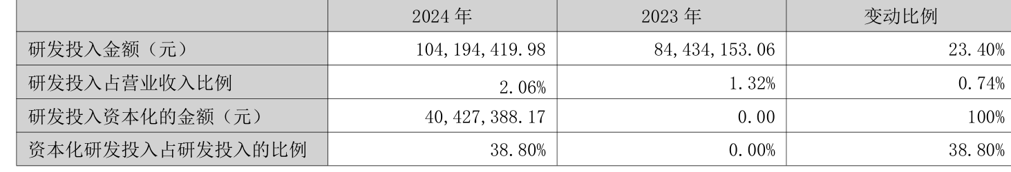 2024年全年,公司研发投入金额为1.04亿元,同比增长23.4%;研发投入占营业收入比例为2.06%,相比上年同期上升0.74个百分点。此外,公司全年研发投入资本化率为38.8%。