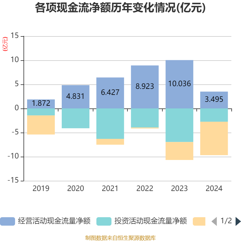 截至2024年,公司经营活动现金流净额为3.5亿元宝尚配资,同比下降65.17%;筹资活动现金流净额-6.94亿元,同比减少3.21亿元;投资活动现金流净额-2.76亿元,上年同期为-6.97亿元。